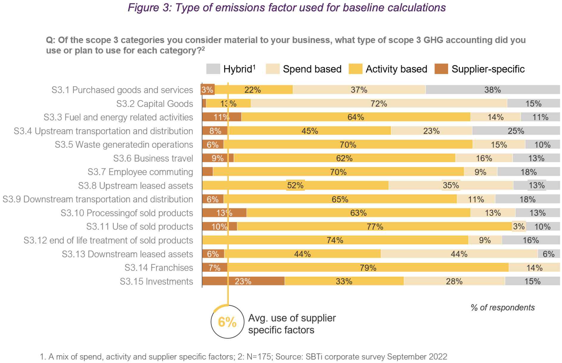 - 供應鏈資訊碎裂化程度高:根據 SBTi 統計,多數企業 (94%) 仍依賴平均值或支出法估算排放,僅 6% 公司使用供應商特定排放係數。