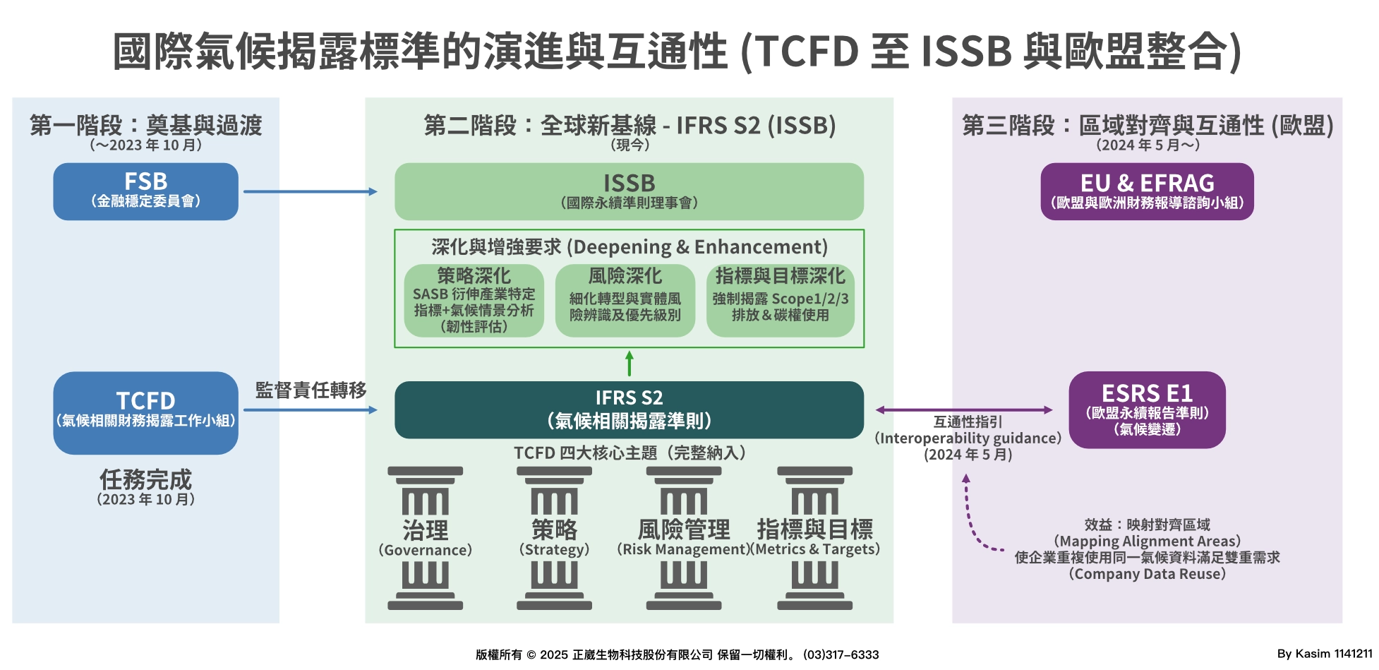 金融穩定委員會 (FSB) 於 2023 年 10 月的氣候相關財務揭露 (TCFD) 報告中確認,TCFD 已完成其任務,自 2024 年起由 ISSB 接手監測全球氣候相關財務揭露進展。IFRS S2 以 TCFD 四大核心主題(治理、策略、風險管理、指標與目標)為架構,並在董事會治理揭露、產業別氣候指標與情境分析、轉型與實體風險管理流程、以及 Scope 1/2/3 排放與碳權使用之揭露上進一步細化要求。此外,IFRS 基金會與 EFRAG 於 2024 年發布互通性指引,對照 IFRS S2 與 ESRS E1 的一致與差異,使企業得以在多數情況下重複使用同一套氣候數據,同時滿足兩套架構的資訊需求。