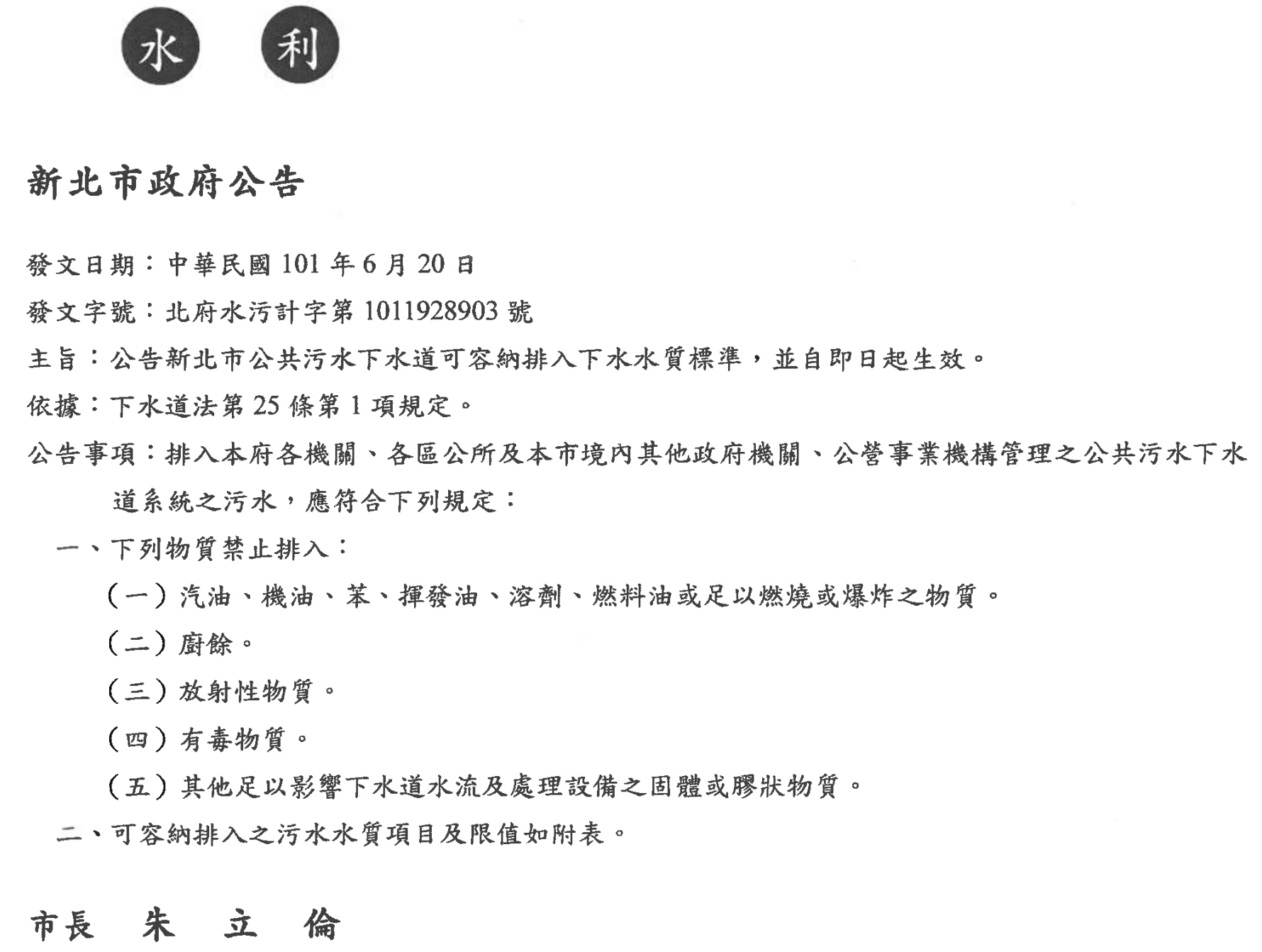 - 新北市,《公共污水下水道可容納排入之下水水質標準》中,直接將「廚餘」列為禁止排入物質。