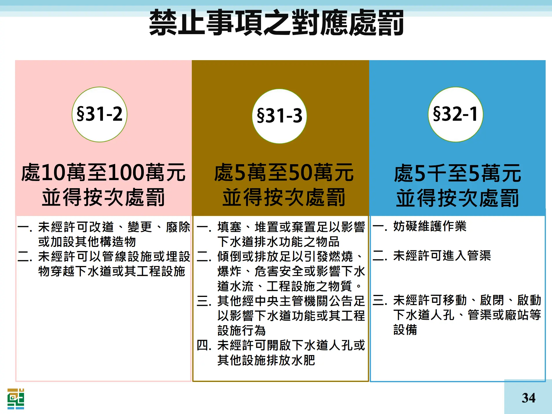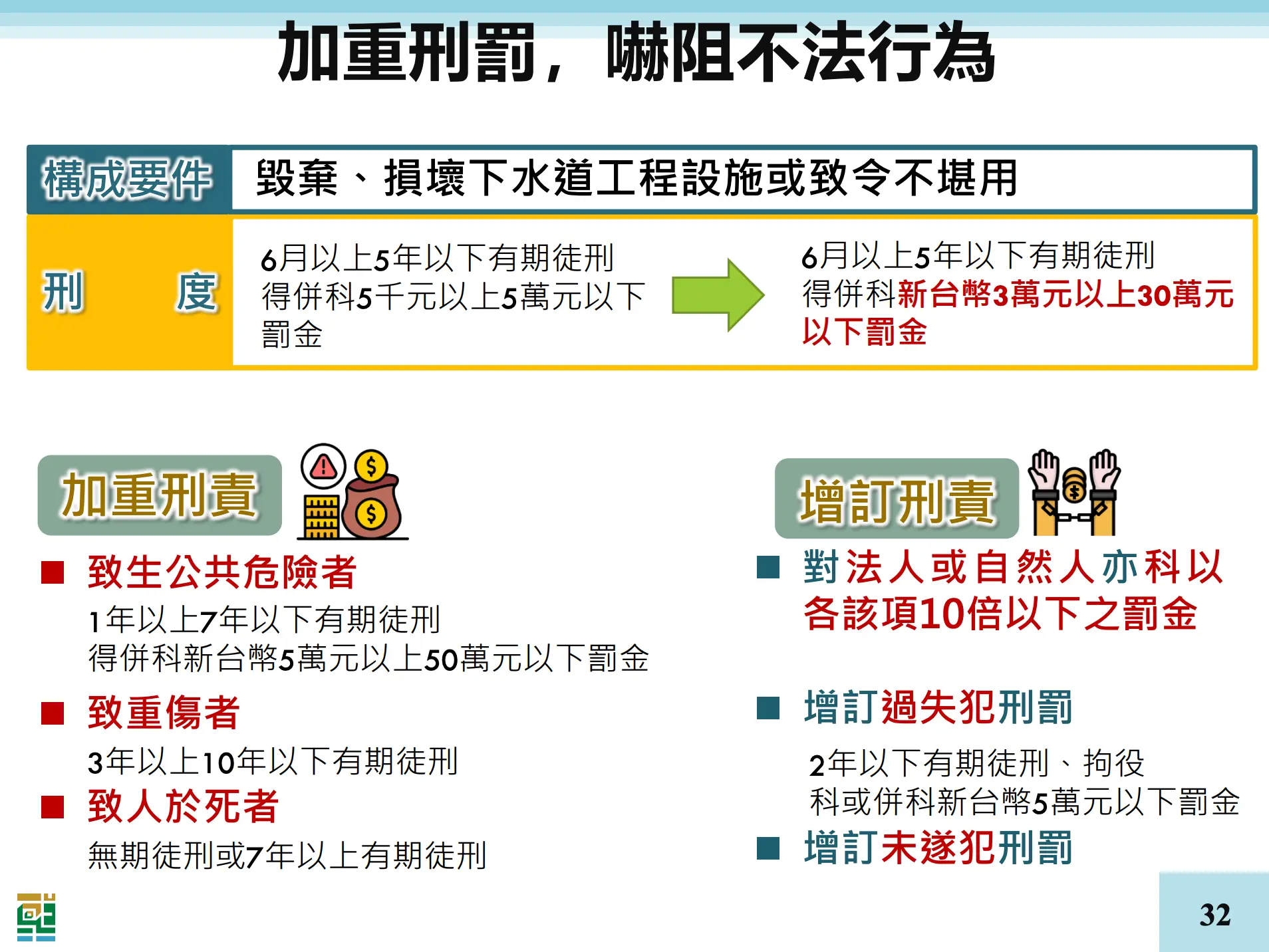 內政部進一步說明,又考量過去屢有違規行為毀損下水道或使其功能受到影響,如雨水下水道因石化氣爆而毀損、不肖業者傾倒廢油導致污水處理廠及再生水廠停止運作等,嚴重損壞公有財產及侵害公眾利益;這次修正草案納入刑罰、增訂相關行政罰及求償機制,凡是造成公共危險、人員重大傷亡者須負起 1 年以上有期徒刑或無期徒刑的刑責,得併科罰金 3 萬至 50 萬;涉及違反禁止事項者,行政裁罰從 5 千元至 100 萬元不等,並可視情節按次處罰,以達有效執行下水道建設與管理,嚇阻各類型的違法行為發生,確保下水道建設及設施設備能夠正常運作,守護居住環境安全及民眾健康。