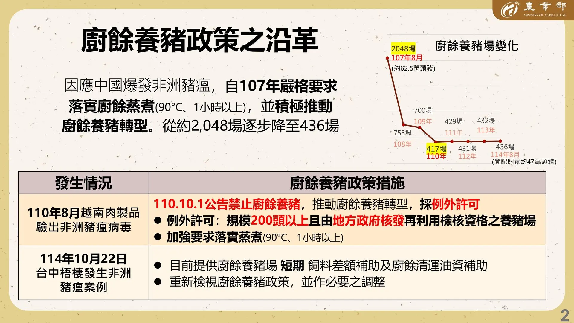 此外,為協助產業加速轉型,農業部亦提供轉型飼料補助及餵飼設備補助,支持廚餘養豬業者朝飼料養豬方式穩健轉型,以降低疫病風險。
