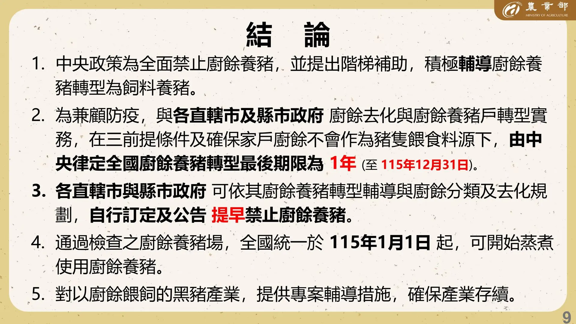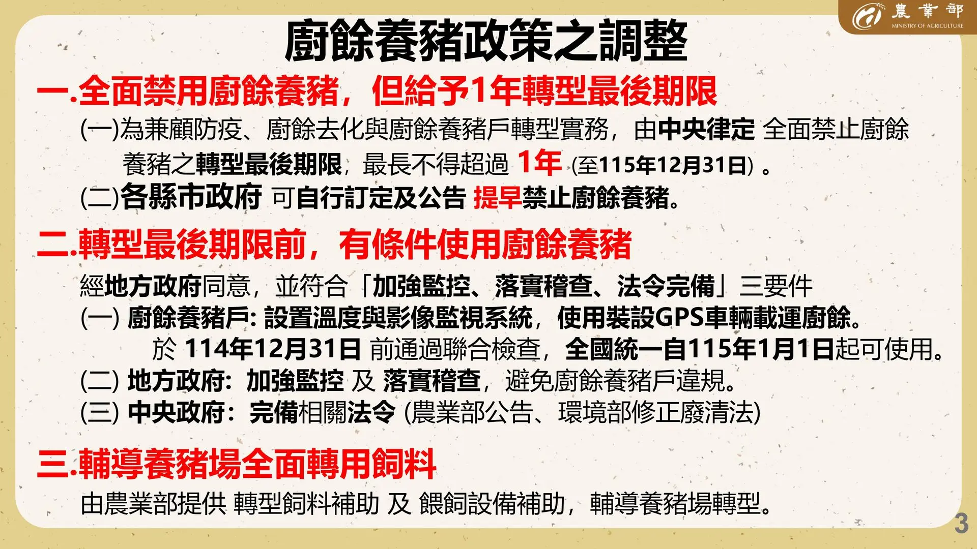 行政院今(4)日院會聽取農業部報告「廚餘養豬政策調整」,農業部表示,為防範非洲豬瘟風險,將全面禁止廚餘養豬之全國轉型最後期限明訂為115年12月31日,並且展開輔導措施,協助廚餘養豬業者轉型。此外,考量各地方在廚餘分類及去化規劃與廚餘養豬轉型輔導的差異,各直轄市或縣市政府可依其規劃,自行公告提早停止廚餘養豬時程及精進作為,以兼顧防疫、廚餘去化與廚餘養豬戶轉型之實務。
