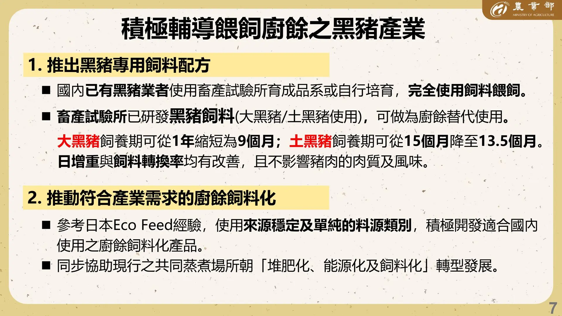 農業部表示,為維護黑豬產業永續發展,農業部後續針對餵養廚餘的黑豬產業,將邀集產學研單位成立專案輔導小組,透過公私協力,加速進行適合飼料飼養的黑豬品種育成,也會針對飼料持續開發,以符合黑豬產業的餵養需求。