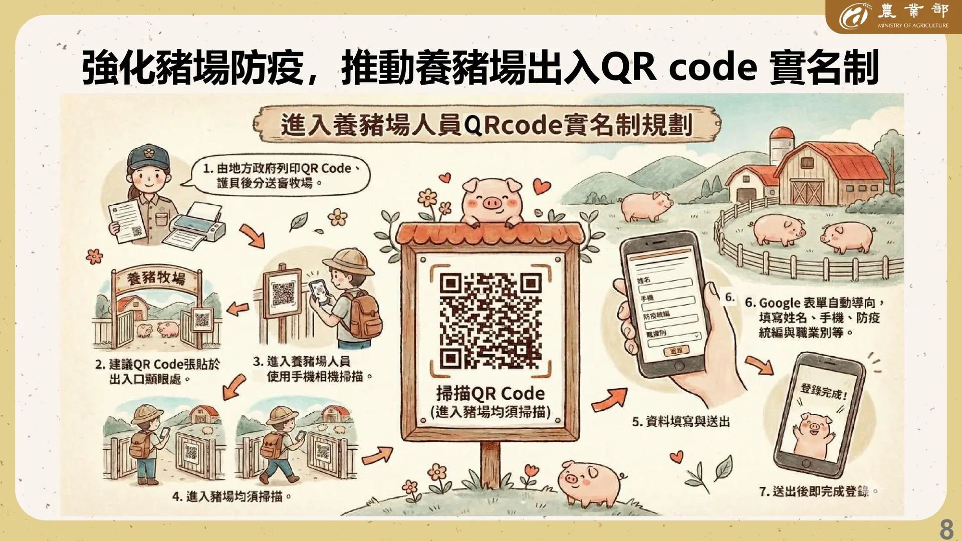 農業部表示,關於「進入養豬場人員QRCode實名制」部分,為強化畜牧場生物安全防護網,有效掌握並追蹤進出牧場人員的流動,規劃導入數位化工具。後續預計將請地方政府防疫單位分送QRCode予養豬場張貼,並請外部人員進出牧場時務必填單,確保後續人員追蹤。